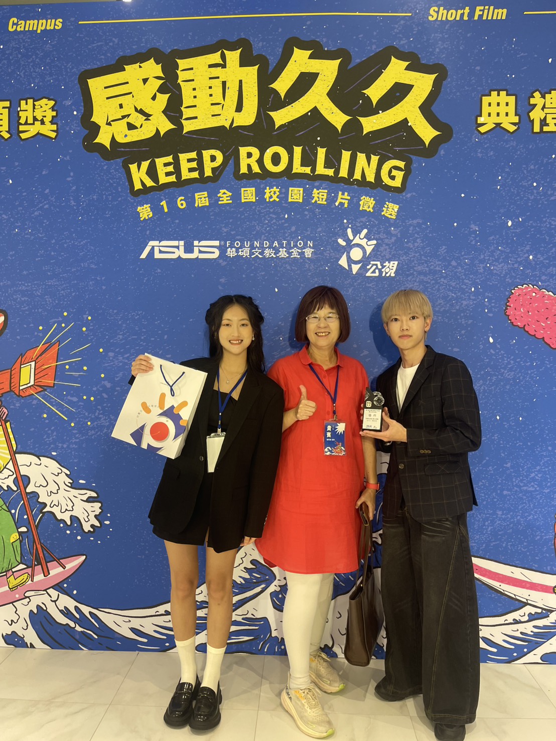 由華碩文教基金會與公視共同舉辦的「感動久久」全國校園短片徵選於9月27日舉行頒獎典禮,本屆徵件近400件,創下近五年新高!最後僅18件作品入選決賽,最後由評審團頒出金獎、銀獎、銅獎、優選等豐富獎項,新聞系小世界康力平老師、陳秀鳳老師指導學生創造出扣人心弦的作品,拿下【直式短影音】金獎及【橫式短影音】佳作,恭喜得獎同學!!