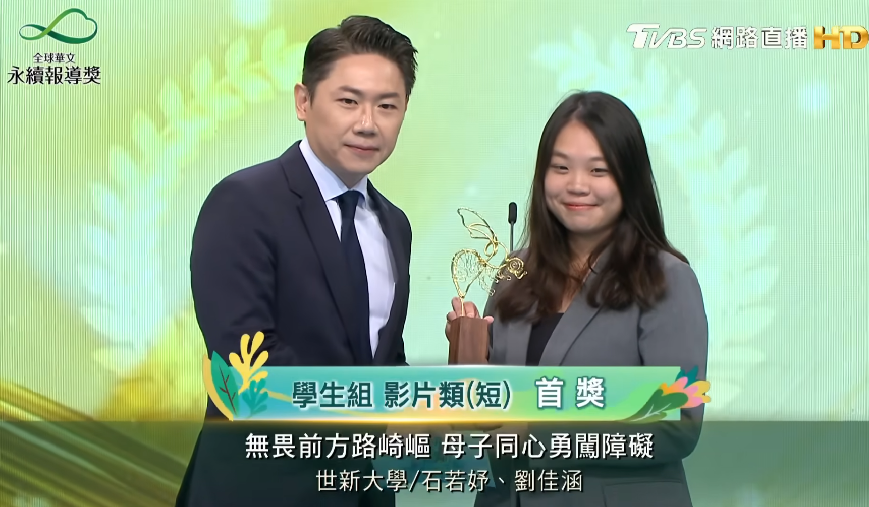 《無畏前方路崎嶇 母子同心勇闖障礙》榮獲學生組影片類(短)首獎。圖片來源/全球華文永續報導獎粉絲專頁直播