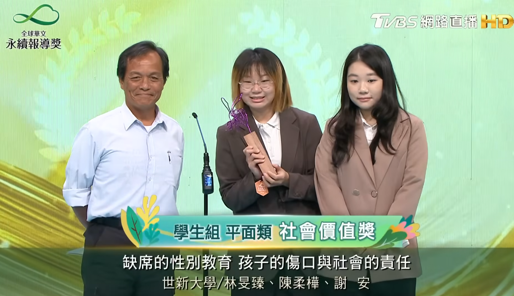 《缺席的性別教育 孩子的傷口與社會的責任》榮獲學生組平面類社會價值獎。圖片來源/全球華文永續報導獎粉絲專頁直播
