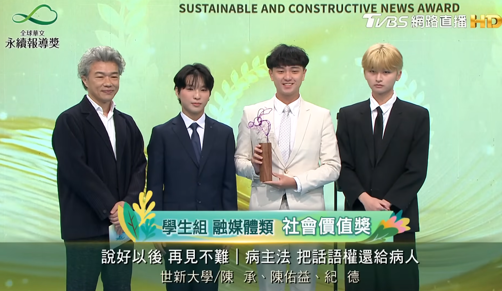 《說好以後 再見不難|病主法 把話語權還給病人》榮獲學生組融媒體類社會價值獎。圖片來源/全球華文永續報導獎粉絲專頁直播